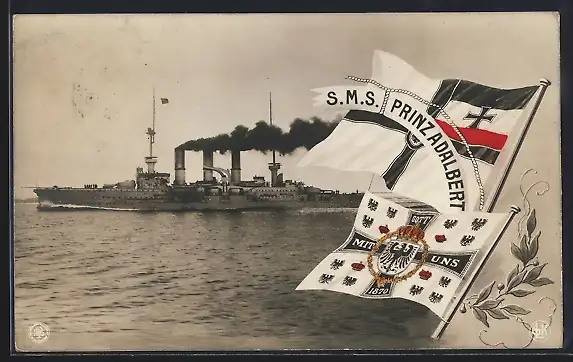 AK Kriegsschiff S.M.S. Prinz Adalbert mit Volldampf durch die ruhige See pflügend, Reichskriegsflagge