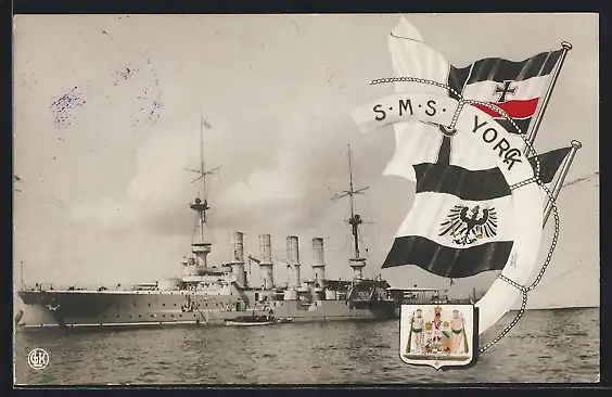 AK Kriegsschiff S.M.S. Yorck neben einem Versorgungsbeiboot auf dem Wasser, Reichskriegsflagge