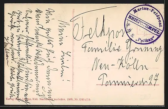 Personenbezogene Daten auf der Rückseite der Karte wurden durch blauen Textmarker unkenntlich gemacht. Die blauen Stellen sind auf die Vorderseite durchgeweicht und wirken sich negativ auf das Postkartenfoto aus