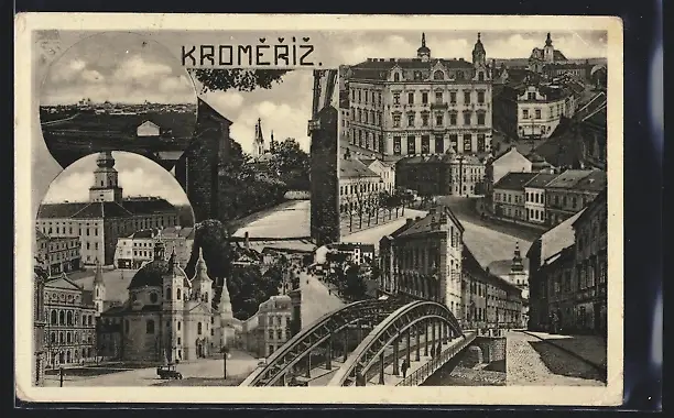 AK Kromeriz, Brücke, Panorama, Kirche und weitere Ansichten, Collage