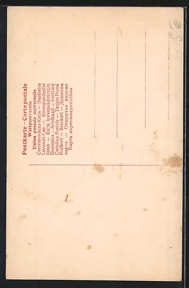 Personenbezogene Daten auf der Rückseite der Karte wurden durch blauen Textmarker unkenntlich gemacht. Die blauen Stellen sind auf die Vorderseite durchgeweicht und wirken sich negativ auf das Postkartenfoto aus