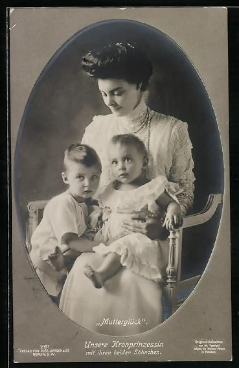 AK Kronprinzessin Cecilie von Preussen mit Schmuck hält ihre beiden Söhne in jungen Jahren im Arm