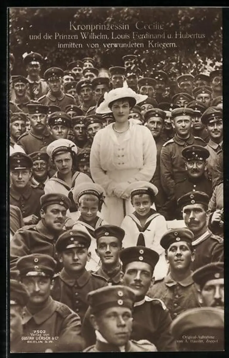 AK Kronprinzessin Cecilie von Preussen mit den Prinzen Wilhelm und Louis Ferdinand inmitten verwundeter Krieger