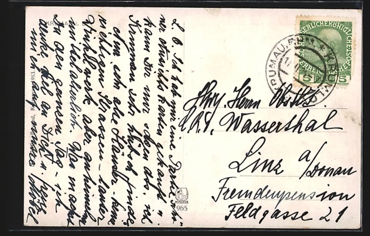 Personenbezogene Daten auf der Rückseite der Karte wurden durch blauen Textmarker unkenntlich gemacht. Die blauen Stellen sind auf die Vorderseite durchgeweicht und wirken sich negativ auf das Postkartenfoto aus