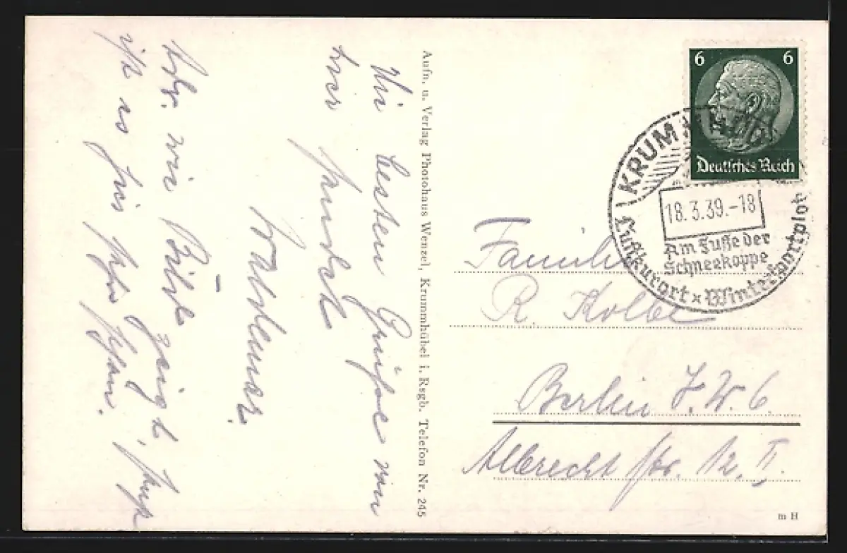 Personenbezogene Daten auf der Rückseite der Karte wurden durch blauen Textmarker unkenntlich gemacht. Die blauen Stellen sind auf die Vorderseite durchgeweicht und wirken sich negativ auf das Postkartenfoto aus