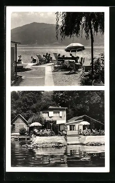 AK Krumpendorf am Wörthersee, Die Strandpension Heinfried, Terrasse und Ansicht vom See