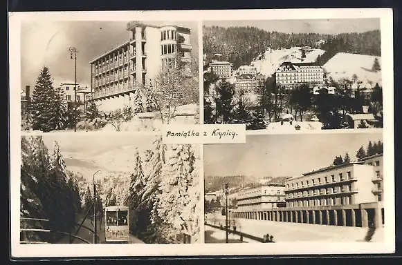 AK Krynica, Ortspartie, Gebäudeansicht und Bahn im Schnee