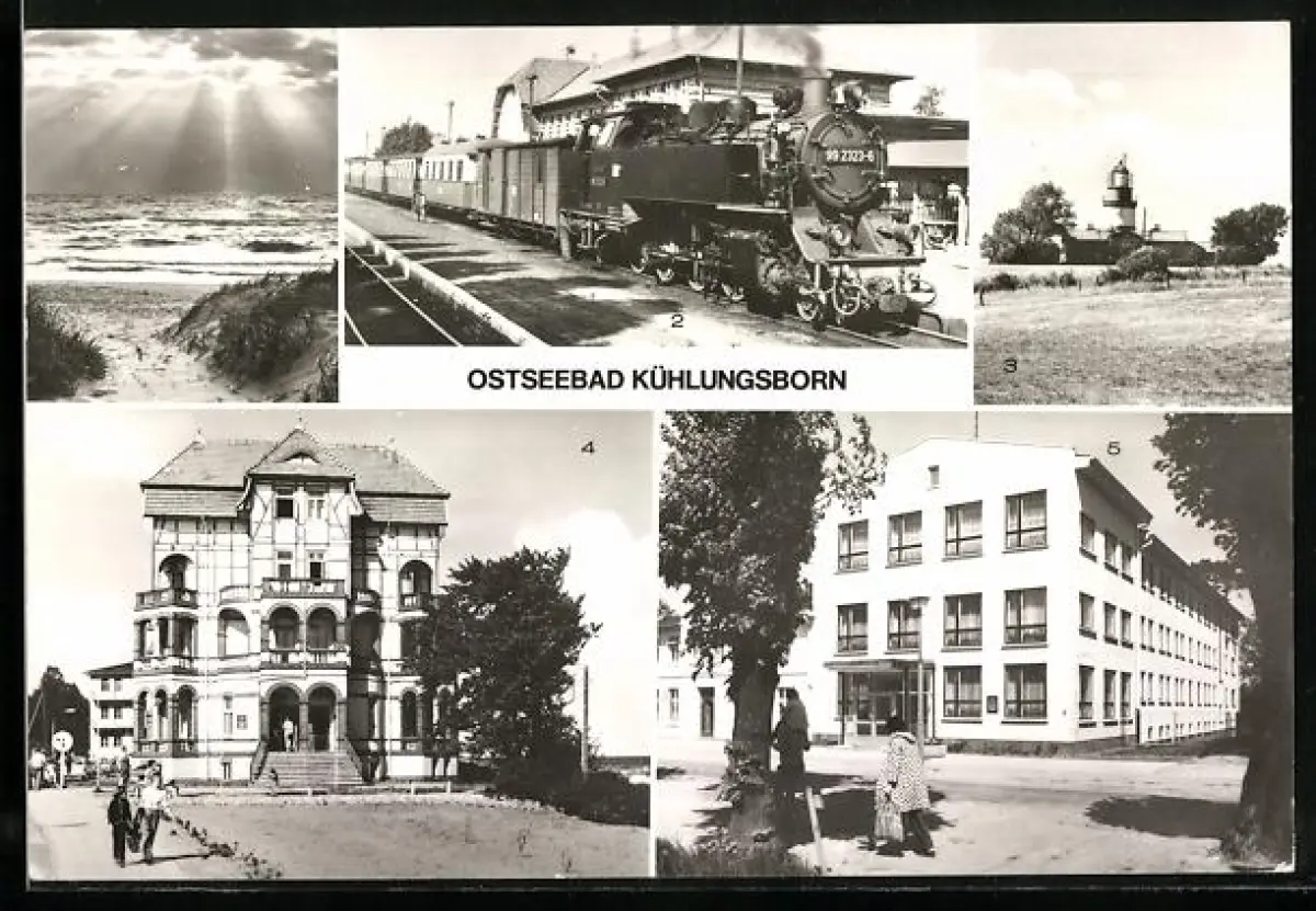 AK Kühlungsborn /Bad Doberan, FDGB-Erholungsheim Schloss am Meer, Strand, Kleinbahn Molli auf dem Bahnhof, Leuchtturm