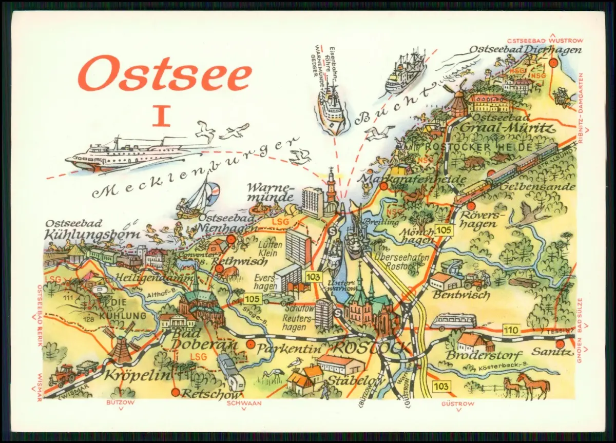 Kühlungsborn, Rostock und Warnemünde – farbenfrohe gezeichnete Karte „Ostsee I – Mecklenburg“ aus der DDR, zeigt Küstenorte und Ferienziele der Region mit maritimen Motiven, Schiffen und Ostseebädern.