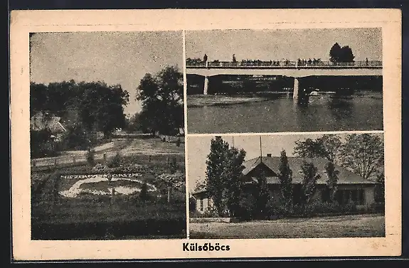AK Külsöböcs, Gebäudeansicht, Brücke, Ortspartie mit Beetanlage