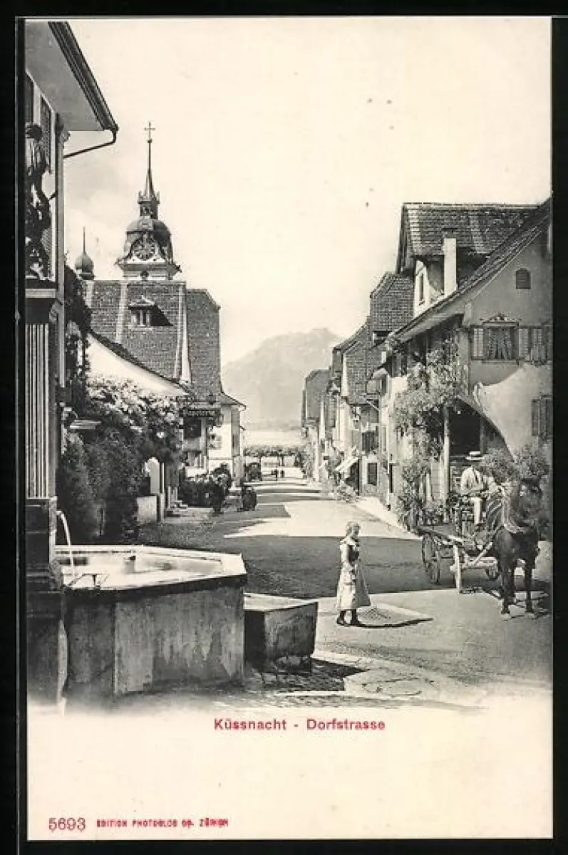 AK Küssnacht /SZ, Dorfstrasse mit Brunnen, Fuhrwerk und Kirchturm