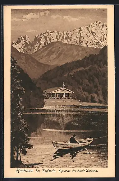 AK Kufstein, Ruderboot vor dem Gasthof auf dem Hechtsee