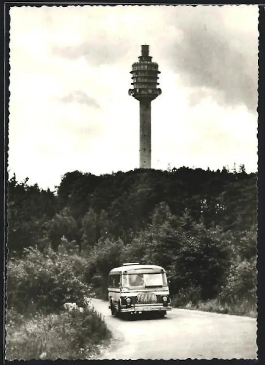 AK Kulpenberg /Kyffh., Fernsehturm, Bus auf Waldstrasse