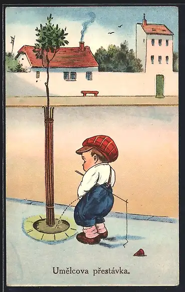 AK Kunstpause, Kleiner Junge pinkelt an den Baum