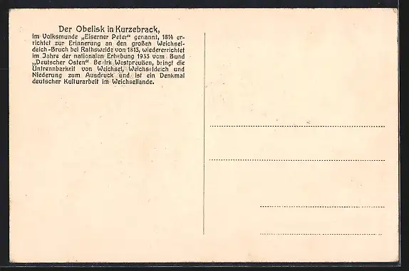 AK Kurzebrack, Obelisk Eiserner Peter, 1814 errichtet zur Erinnerung an den Weichseldeich-Bruch bei Rathsweide 1813