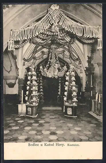 AK Kutná Hora, Sedlec, Kostnice, Knochen u. Totenschädel im Innern der Kirche