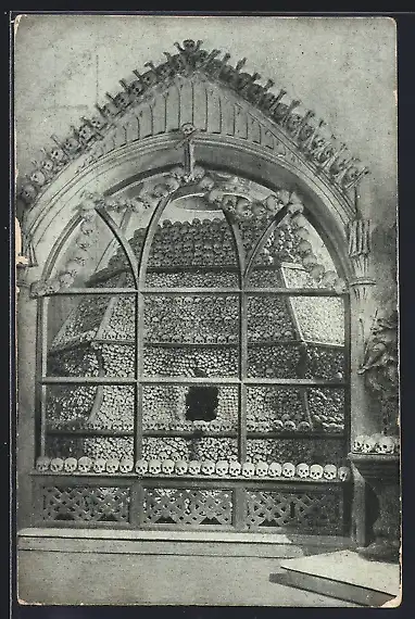 AK Kutná Hora, Sedlec, Pyramida z kosti, Knochen und Gebeine in der Kirche
