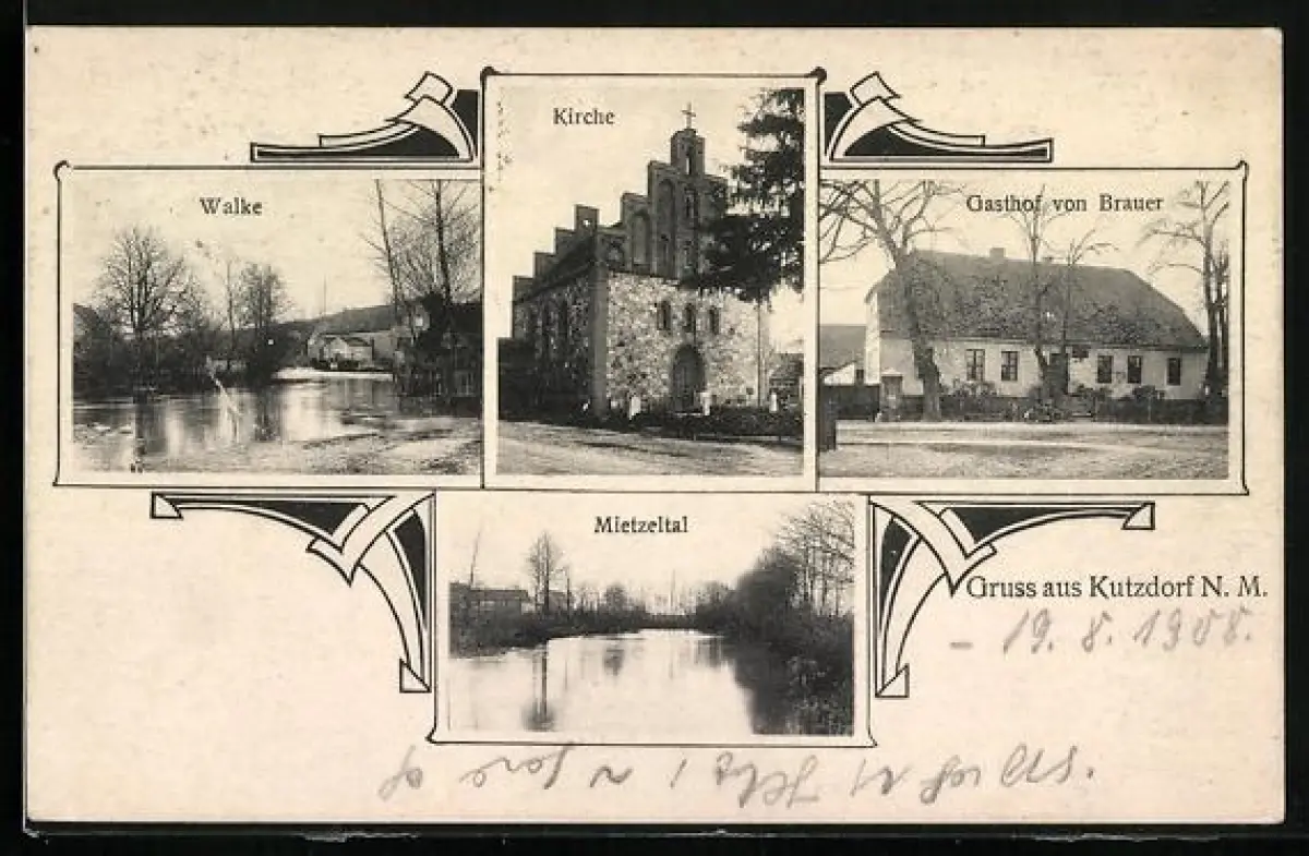 AK Kutzdorf /N. M., Gasthof von Brauer, Kirche, Walke und Mietzeltal