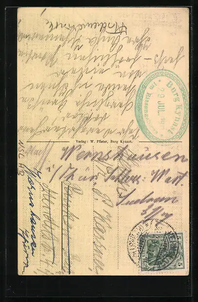 Personenbezogene Daten auf der Rückseite der Karte wurden durch blauen Textmarker unkenntlich gemacht. Die blauen Stellen sind auf die Vorderseite durchgeweicht und wirken sich negativ auf das Postkartenfoto aus
