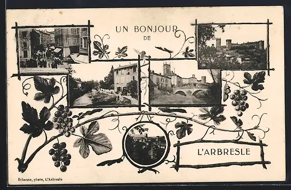AK L`Arbresle, Collage de vues du village avec motifs de vignes et salutation Un Bonjour de L`Arbresle