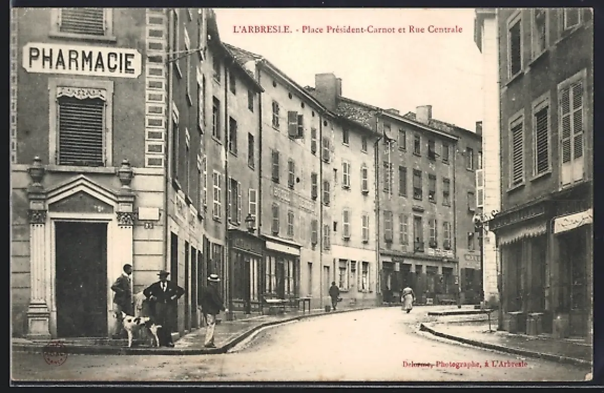 AK L`Arbresle, Place Président-Carnot et Rue Centrale avec une pharmacie et des passants
