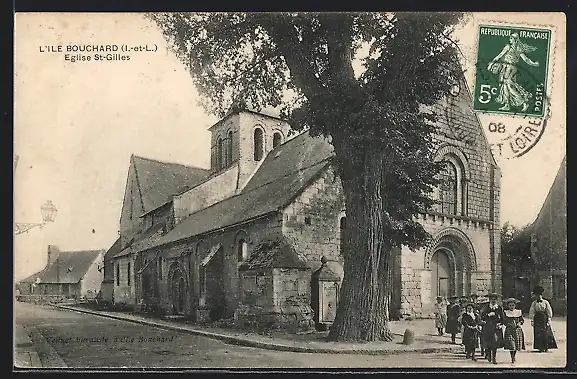 AK L`Ile Bouchard, Église St-Gilles avec des habitants devant