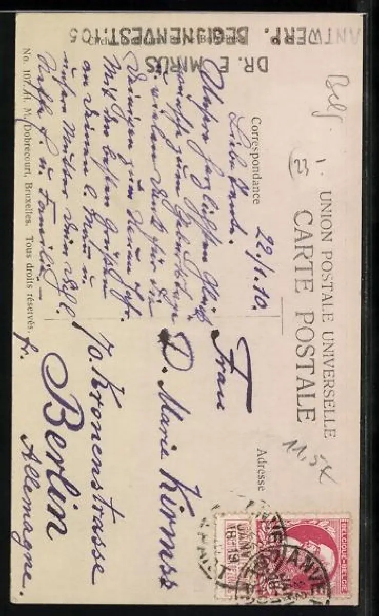 Personenbezogene Daten auf der Rückseite der Karte wurden durch blauen Textmarker unkenntlich gemacht. Die blauen Stellen sind auf die Vorderseite durchgeweicht und wirken sich negativ auf das Postkartenfoto aus