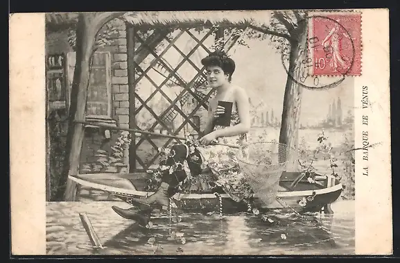 AK La Barque de Vénus, Frau mit Kescher im Boot, Fischerei