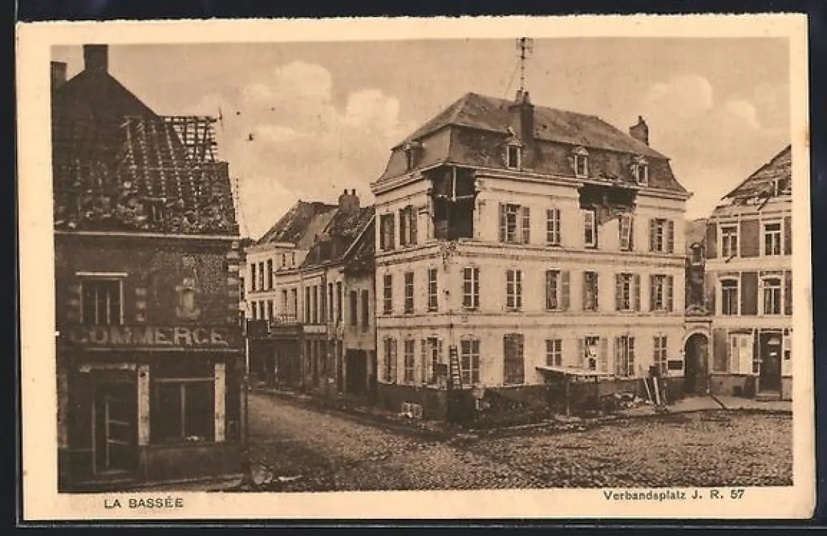 AK La Bassée, Verbandsplatz mit zerstörten Häusern