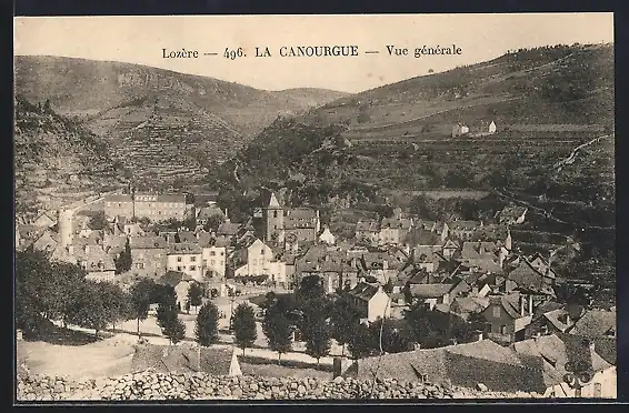 AK La Canourgue, Vue générale du village et des collines environnantes