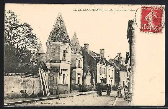 AK La Celle-Guenand, Entrée du Château avec charrette et passants