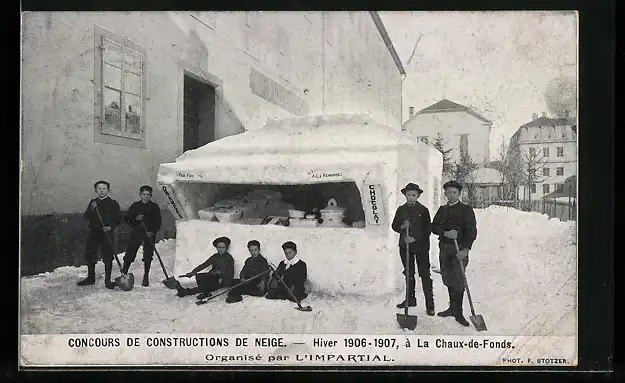 AK La Chaux-de-Fonds, Concours de Constructions de Neige 1906 /1907, Eisplastik in Form eines Marktstandes