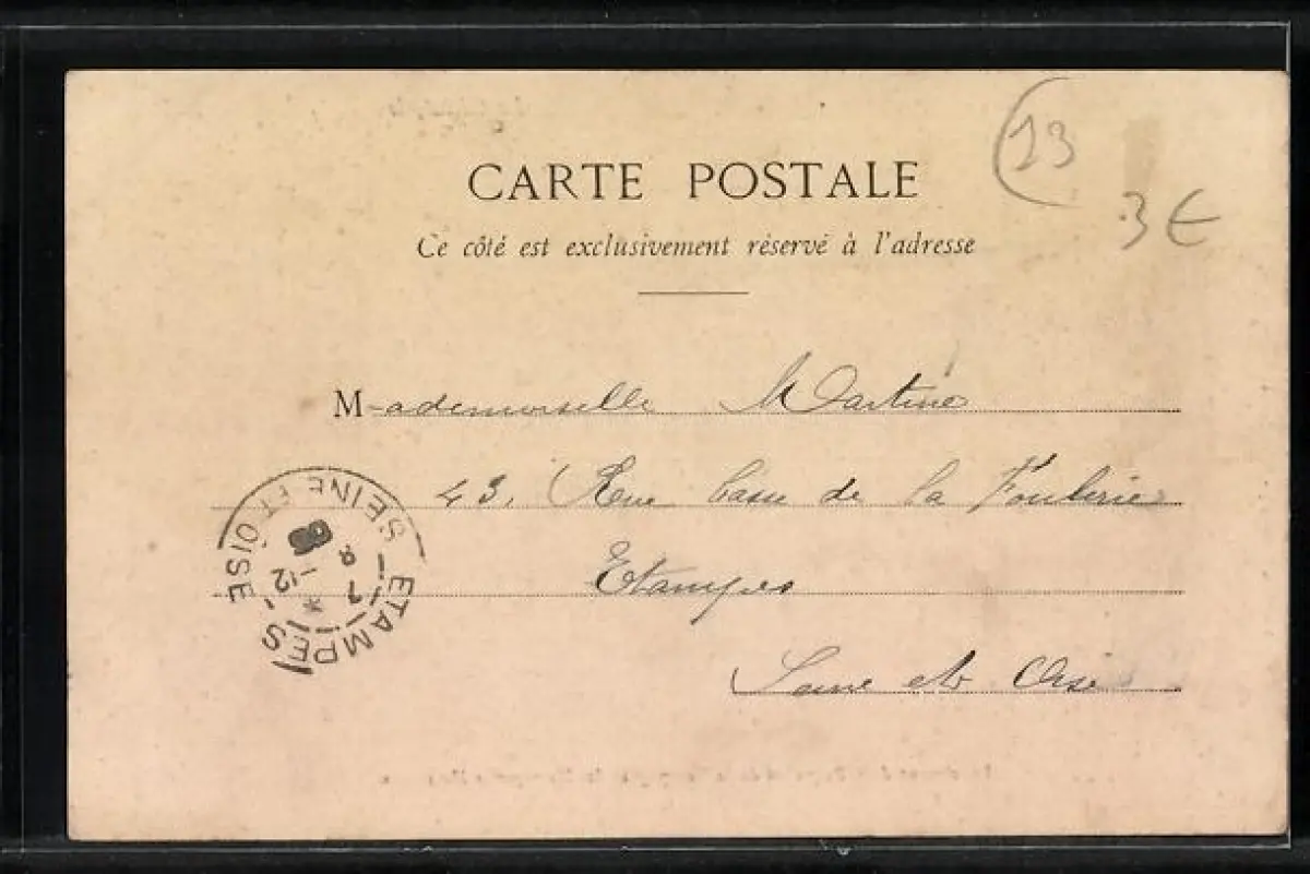 Personenbezogene Daten auf der Rückseite der Karte wurden durch blauen Textmarker unkenntlich gemacht. Die blauen Stellen sind auf die Vorderseite durchgeweicht und wirken sich negativ auf das Postkartenfoto aus
