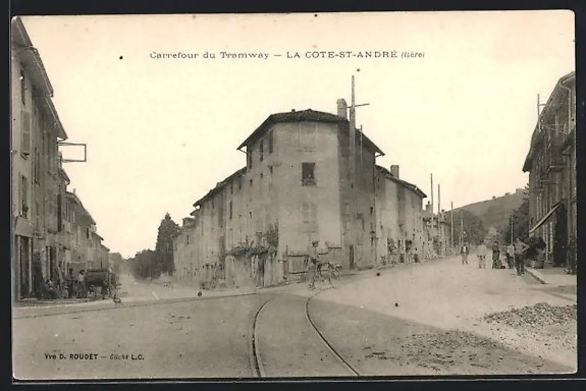 AK La Côte-Saint-André /Isère, Carrefour du Tramway avec bâtiments et lignes de tramway