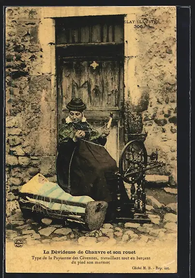 AK La Dévideuse de Chanvre et son Rouet, Bäuerin mit Spinnrad und Säugling in Wiege