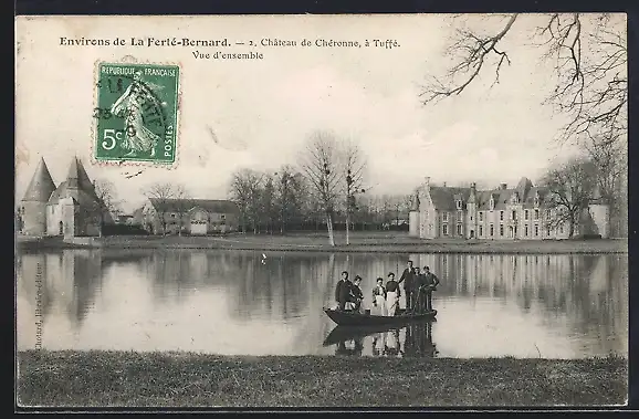 AK La Ferté-Bernard, Château de Cheronne, Vue d`ensemble avec barque sur le lac