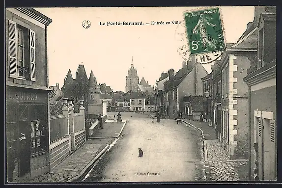 AK La Ferté-Bernard, Entrée en ville avec vue sur la rue pavée et bâtiments historiques