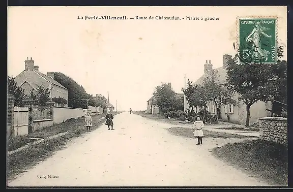 AK La Ferté-Villeneuil, Route de Châteaudun avec mairie à gauche