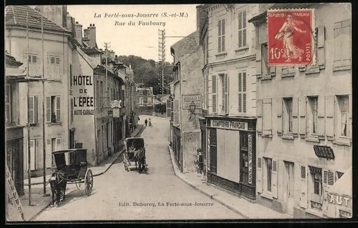 AK La Ferté-sous-Jouarre /S.-et-M., Rue du Faubourg avec calèches et Hôtel de l`Épée