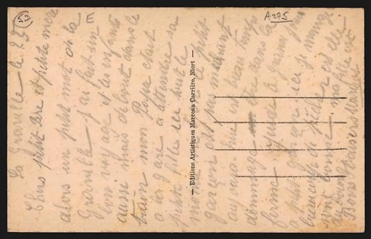 Personenbezogene Daten auf der Rückseite der Karte wurden durch blauen Textmarker unkenntlich gemacht. Die blauen Stellen sind auf die Vorderseite durchgeweicht und wirken sich negativ auf das Postkartenfoto aus
