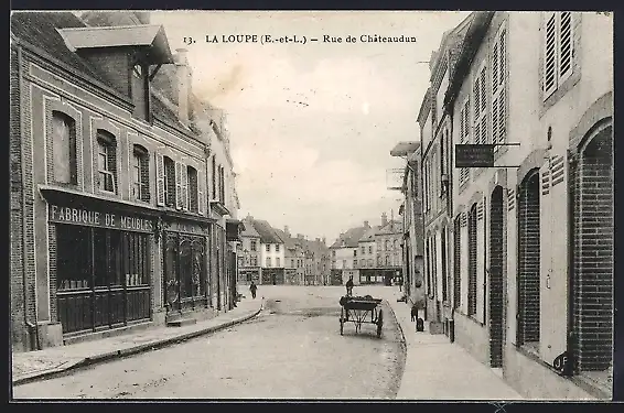 AK La Loupe, Rue de Châteaudun avec une fabrique de meubles et une charrette dans la rue