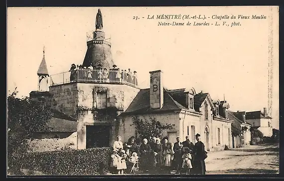 AK La Ménitré, Chapelle du Vieux Moulin Notre-Dame de Lourdes, groupe de personnes devant la chapelle