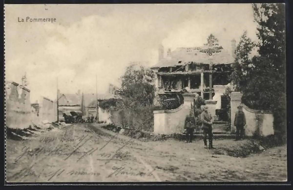 AK La Pommeraye, Maison endommagée avec soldats sur la route