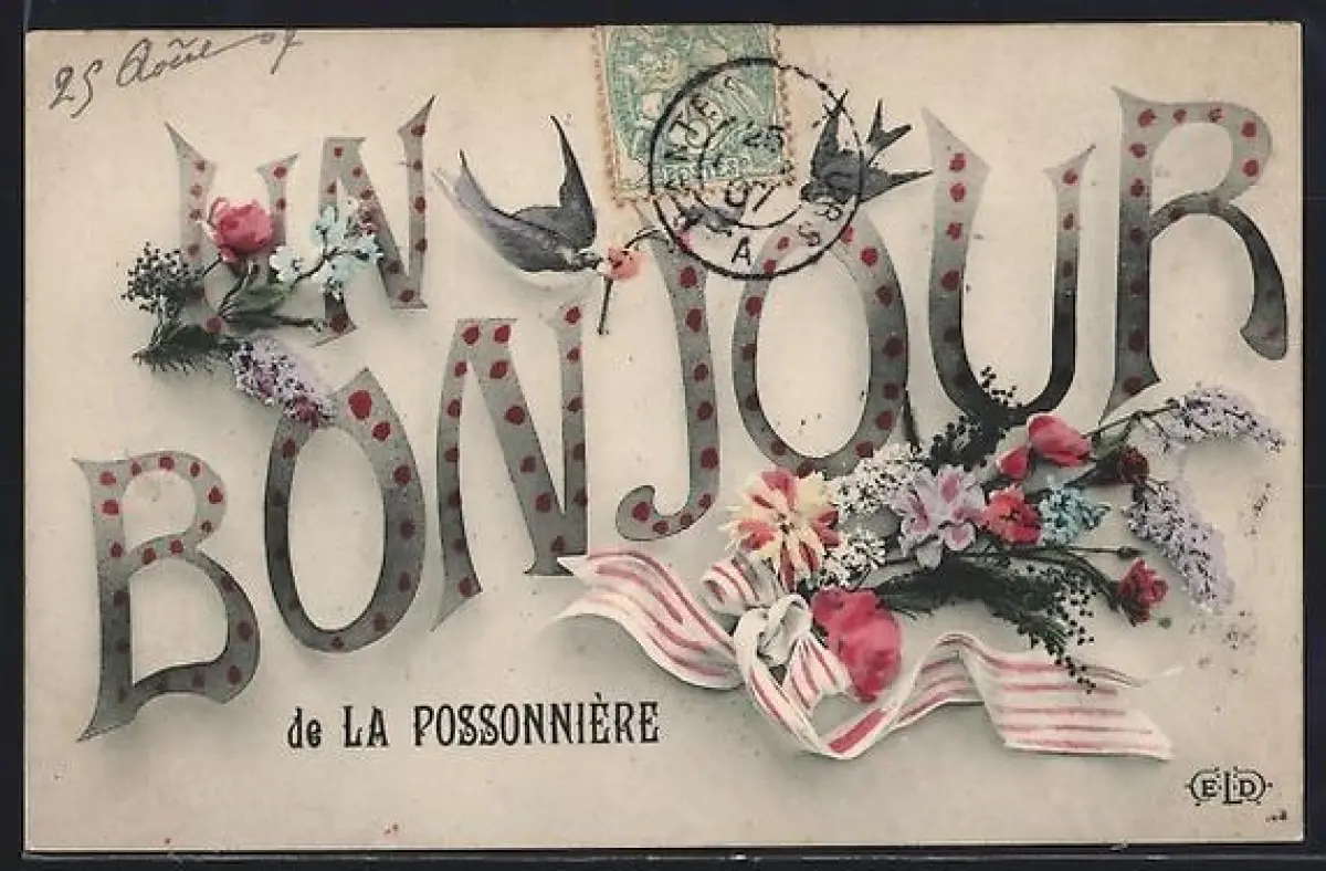 AK La Possonnière, Un bonjour fleuri avec hirondelles