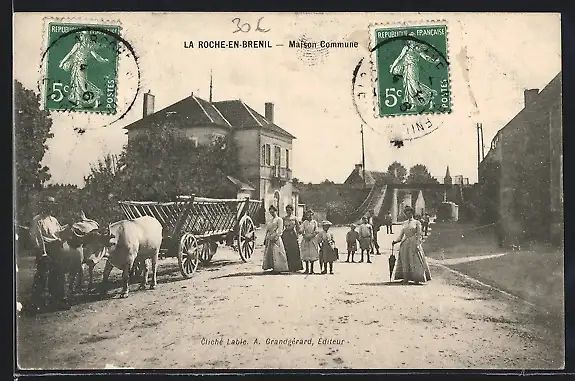 AK La Roche-en-Brenil, Maison Commune avec charrette à boeufs et habitants