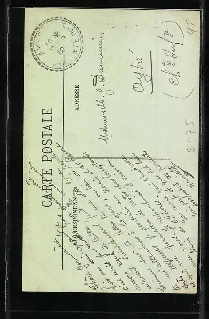 Personenbezogene Daten auf der Rückseite der Karte wurden durch blauen Textmarker unkenntlich gemacht. Die blauen Stellen sind auf die Vorderseite durchgeweicht und wirken sich negativ auf das Postkartenfoto aus