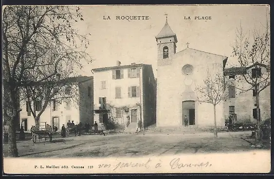 AK La Roquette, La place avec église et maisons adjacentes