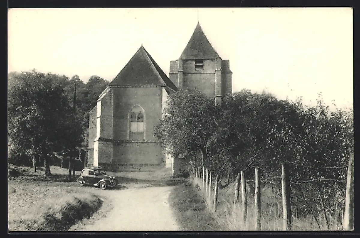 AK La Saulotte, L`église entourée d`arbres et une voiture ancienne sur le chemin