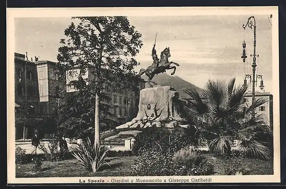 AK La Spezia, Giardini e Monumento a Giuseppe Garibaldi
