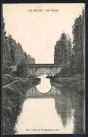 AK La Suze, Le Canal et le pont en pierre entourés d`arbres